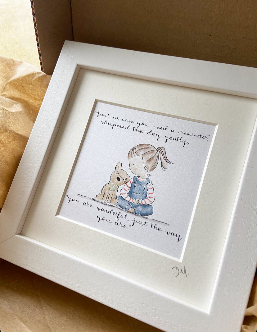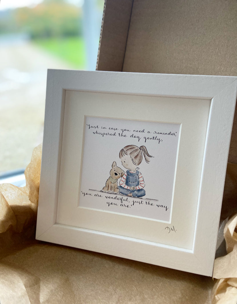 An ink and watercolour drawing, printed on munken art paper, mounted, framed, and packaged in a gift box. The handwritten words included on the print are
