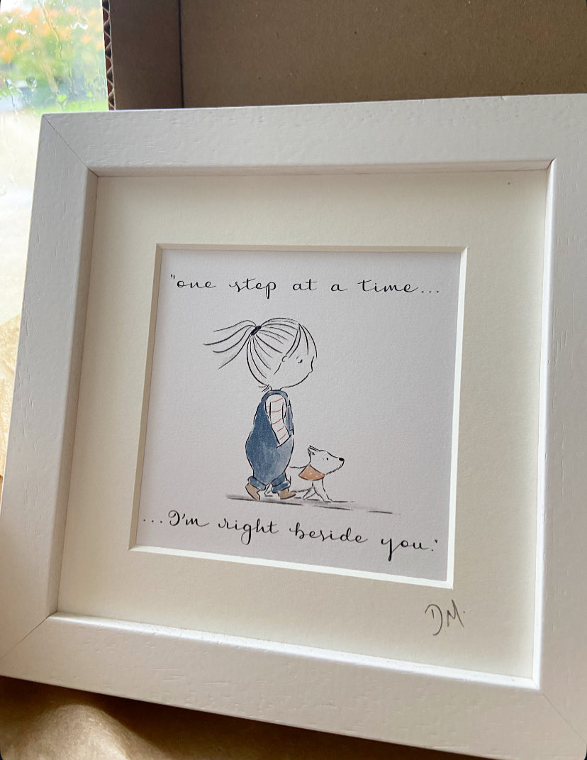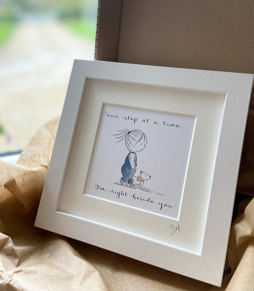 An ink and watercolour drawing, printed on munken art paper, mounted, framed, and packaged in a gift box. The handwritten words included on the print are