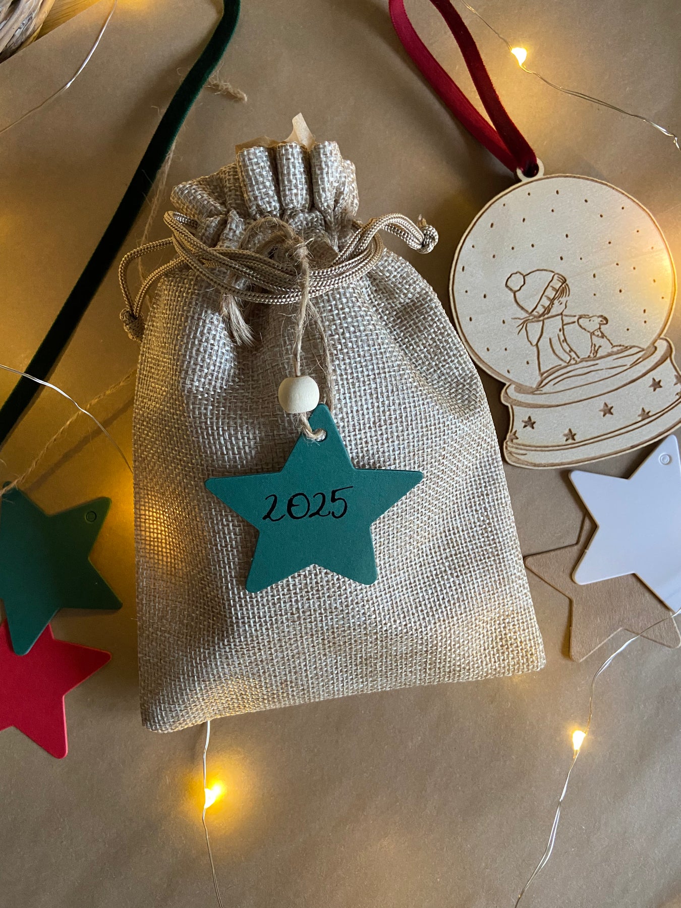 Complete with hand-tied red or green velvet ribbon, and packaged in a drawstring hessian gift bag, with a star gift tag, and "2025" handwritten by Deborah with a dip-pen.